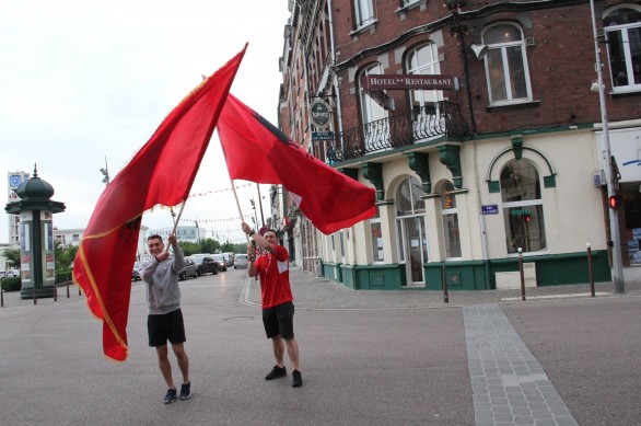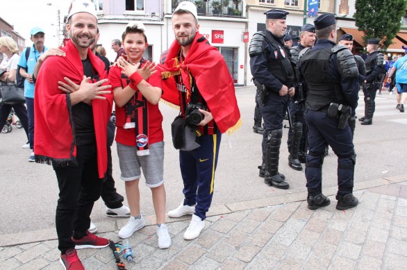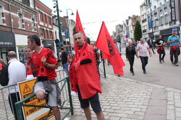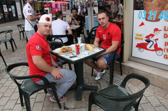 Atmosferë e ndezur mbretëron gjithandej në rrugët e qytetit Lens. Në njërin nga lokalet ku janë tubuar tifozët shqiptarë tashmë ia kanë “krisur” këngës me çifteli dhe brohoritjet s`kanë të ndalur: “Shqipëri-Shqipëri”, “O sa mirë me qenë shqiptar” etj. Edhe fishkëllimat me “vuvuzela” kanë nisur të dëgjohen ashtu si dhe sirenat e makinave.