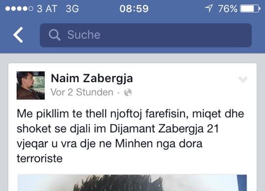 “Më pikëllim të thellë njoftoj farefisin, miqtë dhe shokët se djali im Dijamant Zabergja 21 vjeçar, u vra dje në Minhen nga dora terroriste”, ka shkruar ai, përcjell “albinfo.ch“.