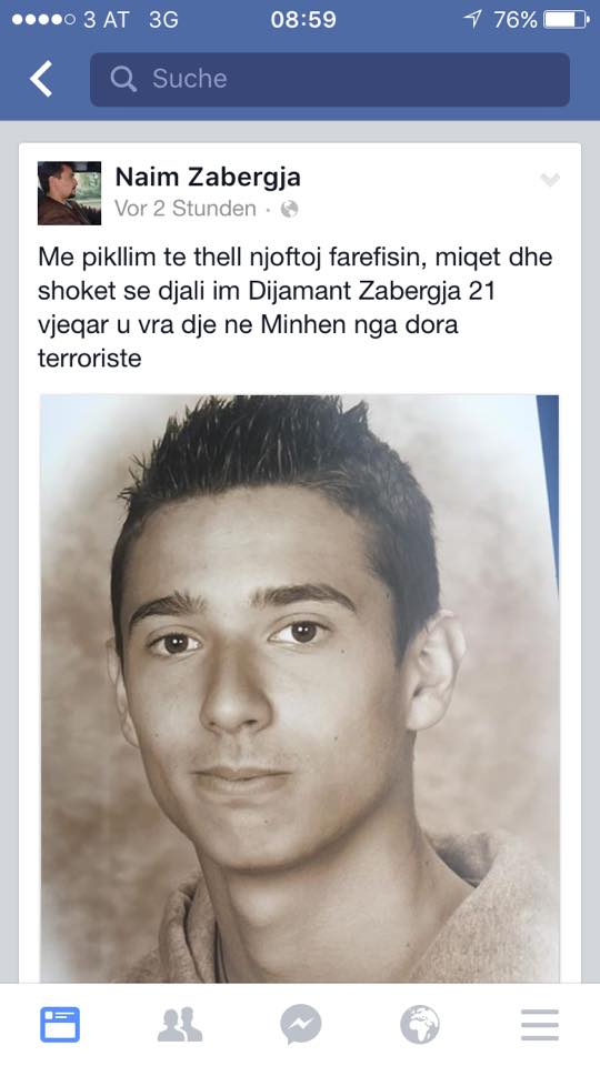 “Më pikëllim të thellë njoftoj farefisin, miqtë dhe shokët se djali im Dijamant Zabergja 21 vjeçar, u vra dje në Minhen nga dora terroriste”, ka shkruar ai, përcjell “albinfo.ch“.