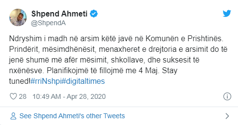 Ahmeti përmes Twitterit ka shkruar se planifikohet që mësimi në shkolla të fillojë më 4 maj