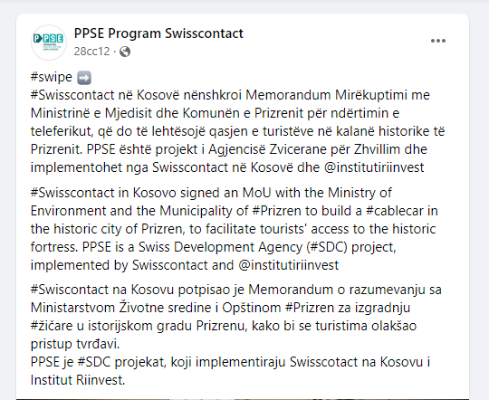 Raportohet se Swisscontact në Kosovë nënshkroi memorandum mirëkuptimi me Ministrinë e Mjedisit dhe Komunën e Prizrenit për ndërtimin e teleferikut, që do të lehtësojë qasjen e turistëve në kalanë historike të Prizrenit, përcjell albinfo.ch.