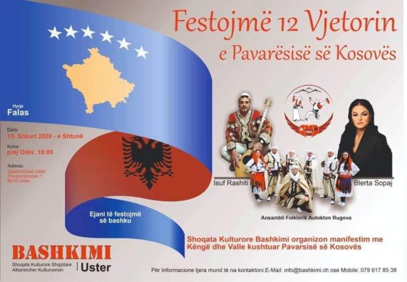 Në Uster të Zvicrës, Shoqata Kulturore Shqiptare organizon një manifestim kulturor me rastin e Pavarësisë së Kosovës, pjesë e të cilit do të jetë edhe Ansambli Folklorik Autokton “Rugova”, i njohur për interpretimin mbresëlënës të valleve tradicionale, shkruan albinfo.ch.