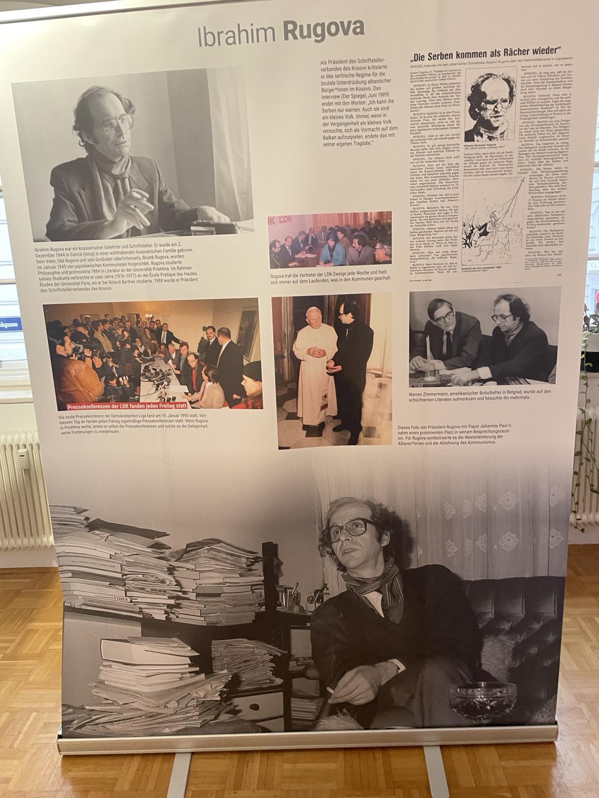 “Dr.Ibrahim Rugovën e kam takuar dy herë para se të bëhej president. Njëherë, në Amerikë dhe njëherë tjetër këtu në Vjenë. Ajo që të bënte përshtypje gjatë kohës sa rrije më të, ishte se, dukej sikur i përhumbur, sikur nuk ishte aty me ty teksa bisedonim. Papritmas, kuptoje që kishe të bëje me një njeri të hekurt dhe që e dinte jashtëzakonisht mirë se çfarë po bën. Ai e dinte se çfarë do. Dhe, kur njeriu e di se çfarë do, atëherë gjënë edhe rrugën për të arritur deri aty. Ky është edhe shembulli më i mirë i presidentit Rugova që na ka lënë. Kam përshtypjen që edhe kjo ekspozitë dhe ky emërtim “Gewaltfreiheit” i atribuohet më së miri presidentit Rugova”, theksoi ambasadori Bimo.