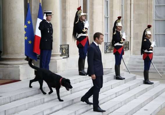 Qeni labrador-griffon, gati dy vjeç, vazhdon traditën e mbajtjes së qenëve nga presidentët francezë