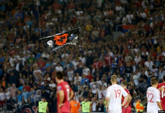Pastaj një futbollist serb e mori në hapësirë, pa rënë në tokë, flamurin me simbole shqiptare e lojtarët e kombëtares vrapuan menjëherë pas tij duke ia rrëmbyer nga duart.