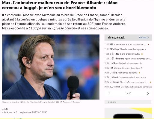 Por, është pikërisht personi i quajtur Maks, i cili prej vitesh është spiker i stadiumit, që ka rrëfyer për “L’Equipe” makthin që përjetoi ato momente kur ngatërroi Shqipërinë me Armeninë, si edhe kohët e vështira ditë pas asaj gafe, deri tek ndeshja tjetër që Franca luajti mbrëmë, ndaj Andorrës, shkruajnë mediat shqiptare, përcjell albinfo.ch.