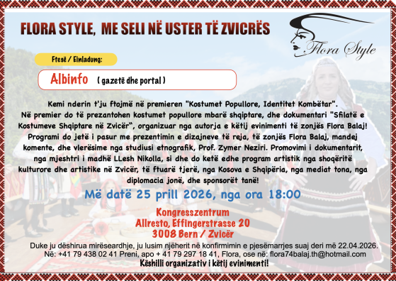 Më 25 prill 2026, nga ora 18:00, në Kongresszentrum Allresto në Bern do të mbahet premiera e eventit kulturor “Kostumet Popullore, Identitet Kombëtar”, organizuar nga Flora Style.