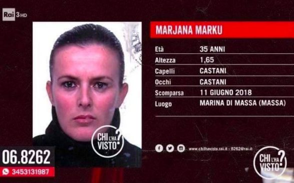 Një grua shqiptare me qëndrim në komunën italiane Marina di Massa është raportuar e zhdukur që prej 11 qershorit. Ajo është Marjana Marku, 35-vjeçare, nënë e dy fëmijëve, e rasti u bë publik në emisionin “Chi l’ha visto?”, i transmetuar në Rai3. Prej disa ditësh foto e saj po qarkullon edhe në rrjetet sociale, pas denoncimit të bërë në polici nga familjarë të gruas shqiptare.