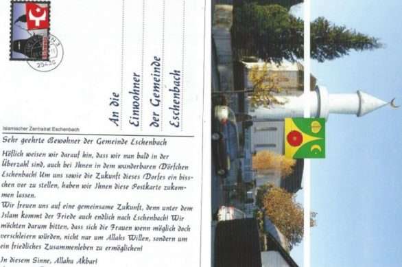 Një kartolinë misterioze në të cilën shihet një minare xhamie e ngulitur përmes fotomontazhit në panoramën e fshatit, ka befasuar qytetarët e disa vendbanimeve zvicerane.