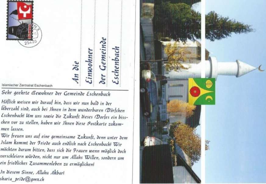 Shkruesi i tekstit, i cili identifikohet si “Këshilli Qendror Islamik” i qytetit ose fshatit përkatës (Lachen, Herrliberg, Eschenbach etj.) në vazhdim thotë se “gëzohet se më në fund nën islamin do të vijë edhe paqja në fshatin tuaj, transmeton albinfo.ch. “Ne duam të ju lusim që gratë, nëse është e mundur, t`i mbuloni, jo vetëm për hir të vullnetit të Allahut por edhe për të mundësuar një bashkëjetesë paqësore!”.