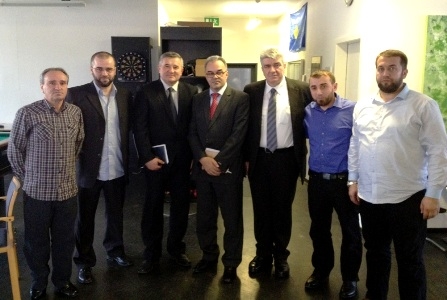 © albinfo.ch: Ministri Ćerim Bajrami, zv. konsulli Salih Sefa dhe këshilltari Ahmet Asani, në mesin e aktivistëve boshnjakë. Në sfond, Flamuri i Kosovës