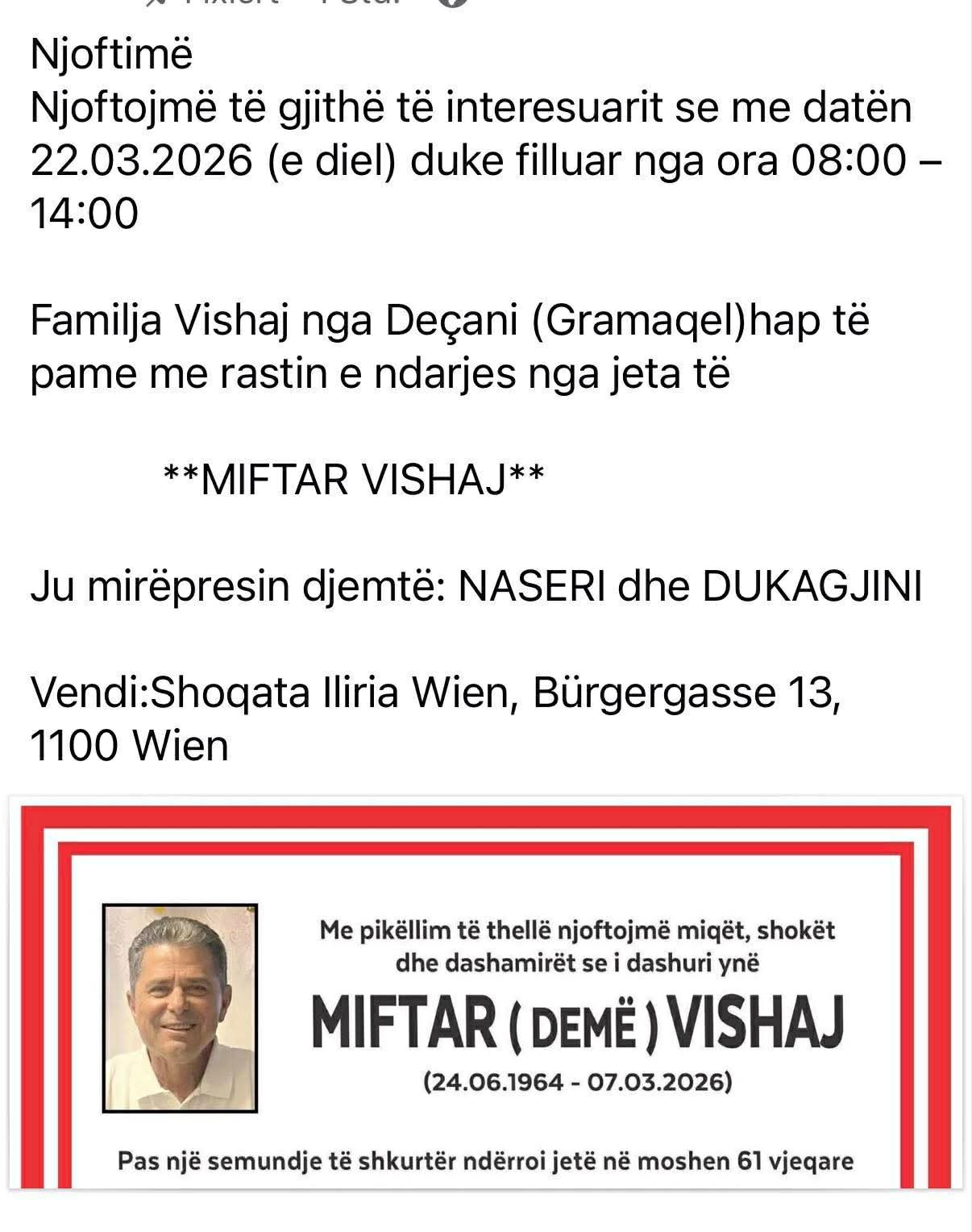 Ka ndërruar jetë në moshën 61-vjeçare Miftar (Demë) Vishaj nga Deçani, përkatësisht nga fshati Gramaqel. Lajmin për vdekjen e tij e kanë bërë të ditur familjarët përmes një njoftimi mortor.