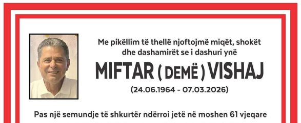 Ka ndërruar jetë në moshën 61-vjeçare Miftar (Demë) Vishaj nga Deçani, përkatësisht nga fshati Gramaqel. Lajmin për vdekjen e tij e kanë bërë të ditur familjarët përmes një njoftimi mortor.