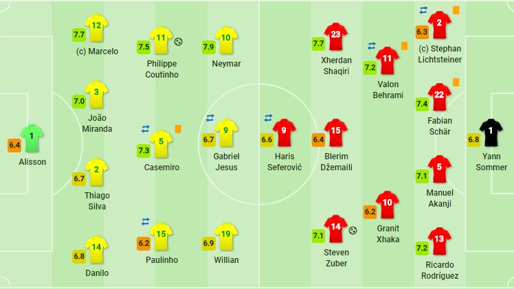 Pas ndeshjes janë dhënë edhe notat për lojtarët. Befasisht Neymar mori notën më të madhe të ndeshjes 7.9, derisa te Zvicra notën më të lartë e kishte Shaqiri 7.7. Behrami është vlerësuar me 7.2, Xhemaili me 6.4 dhe Xhaka 6.2.