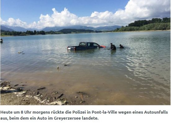 Policia zvicerane ka intervenuar të shtunën në Pont-la-Ville të Fribourgut, pasi një veturë ishte vënë në lëvizje dhe papritmas ishte zhytur në ujërat e Liqenit Gruyère. Për fat të mirë, asnjë person nuk ka qenë në veturë, njofton Policia Kantonale e Fribourgut, përcjell Albinfo.ch.