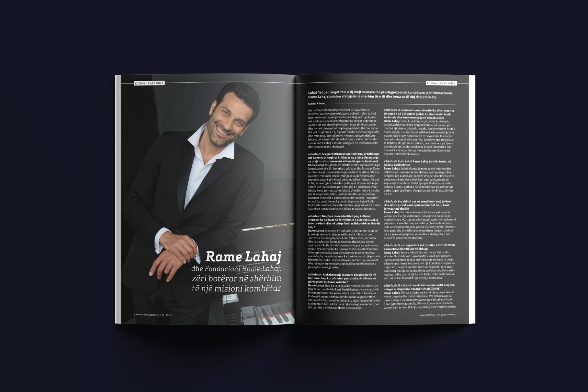 Rame Lahaj në intervistën që i ka dhënë revistës sonë flet për zhvillimin e tij si tenor i shquar që ka dalë në skenën botërore nga një ambient me kushte modeste, çfarë është Kosova. Ai tregon po shtu hollësi rreth punës së fondacionit që ka krijuar, që mban emrin e tij. Dhe së fundi, Lahaj shpalos edhe programin e paraqitjes së tij të parë në Zvicër, që do të bëhet më 18 shkurt në Gjenevë dhe që i kushtohet DItës së Pavarësisë së Kosovës.