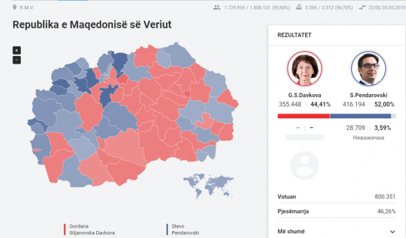 Deri më tani sipas medave vendore, nga 93.31% të kutive të numëruara, kryeson Stevo Pendarovski nga LSDM me 52,24 % ose 395.416 vota, kundër kandidatës opozitare Gordana Silanovska nga VRMO DPMNE, e cila ka 44.19% ose 334.508 vota.