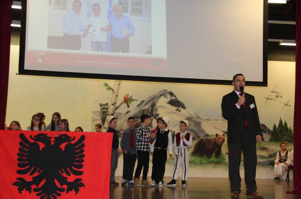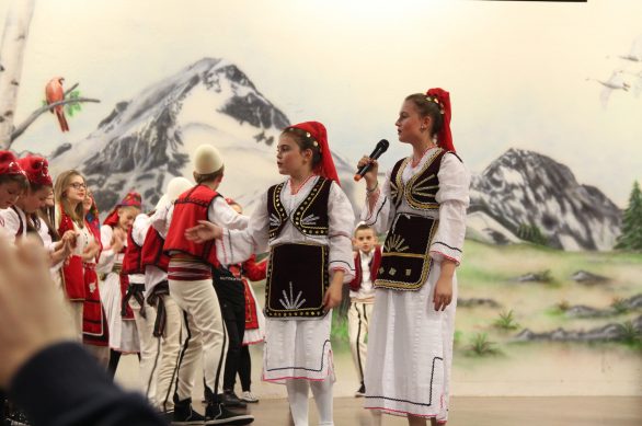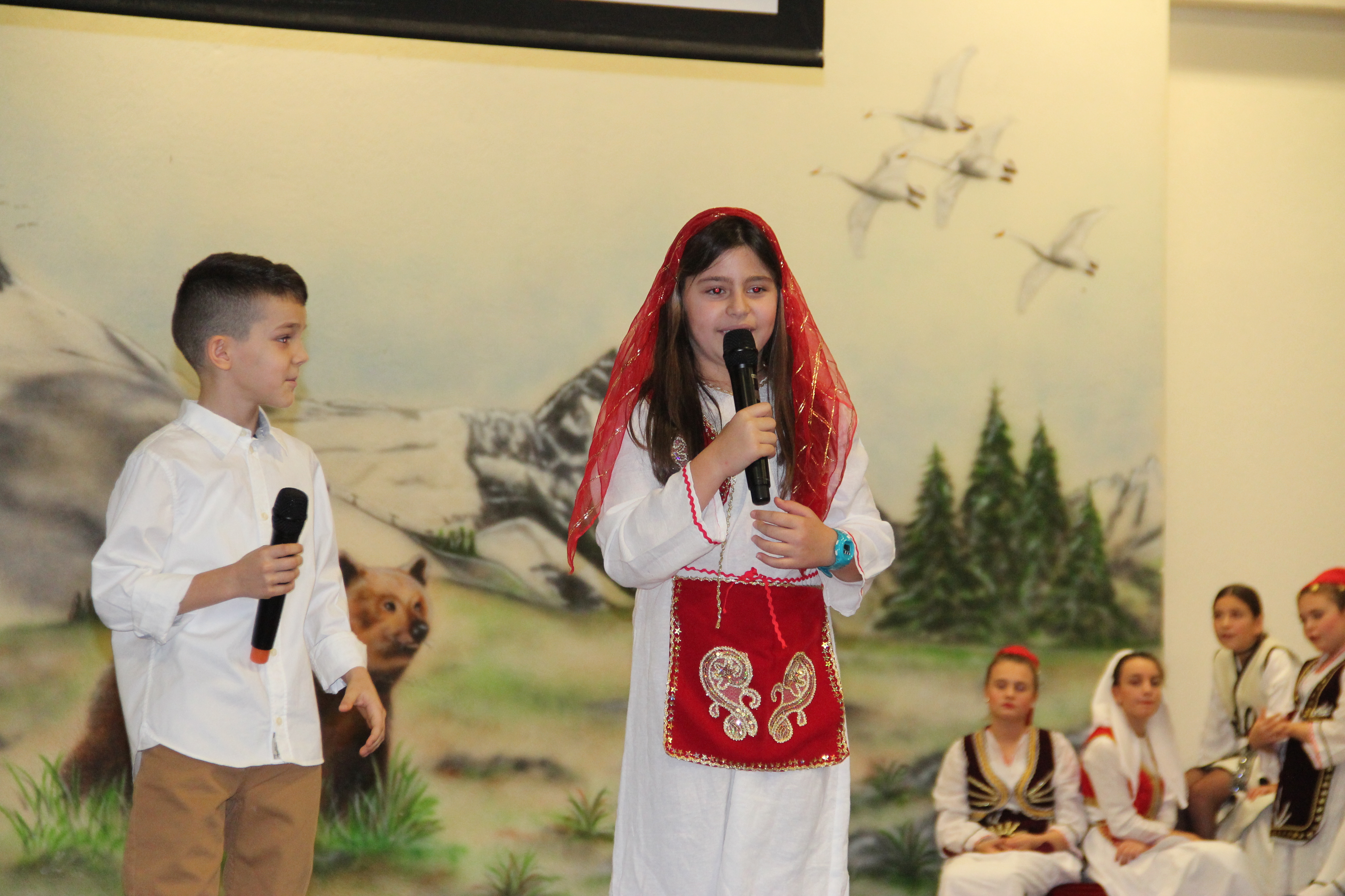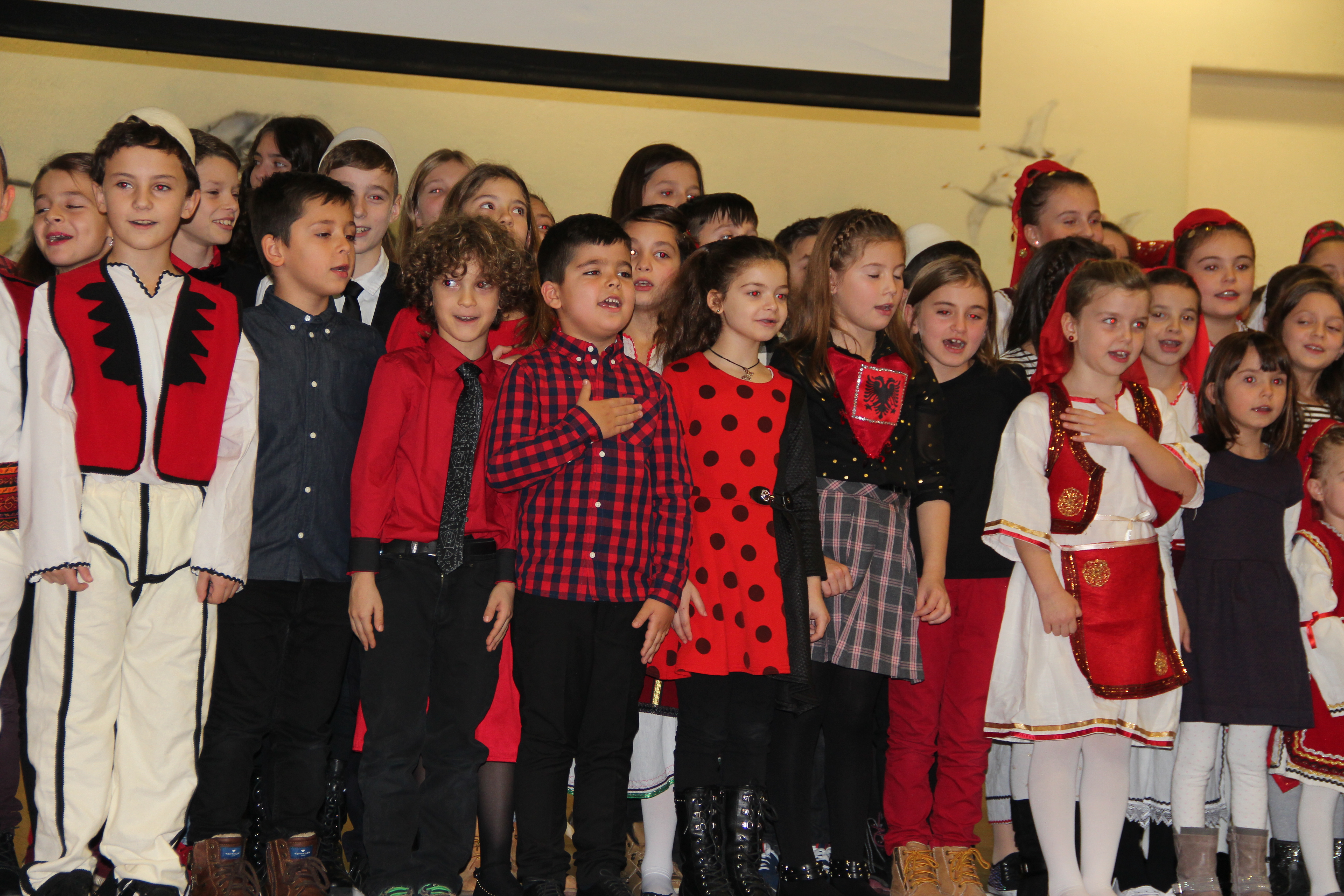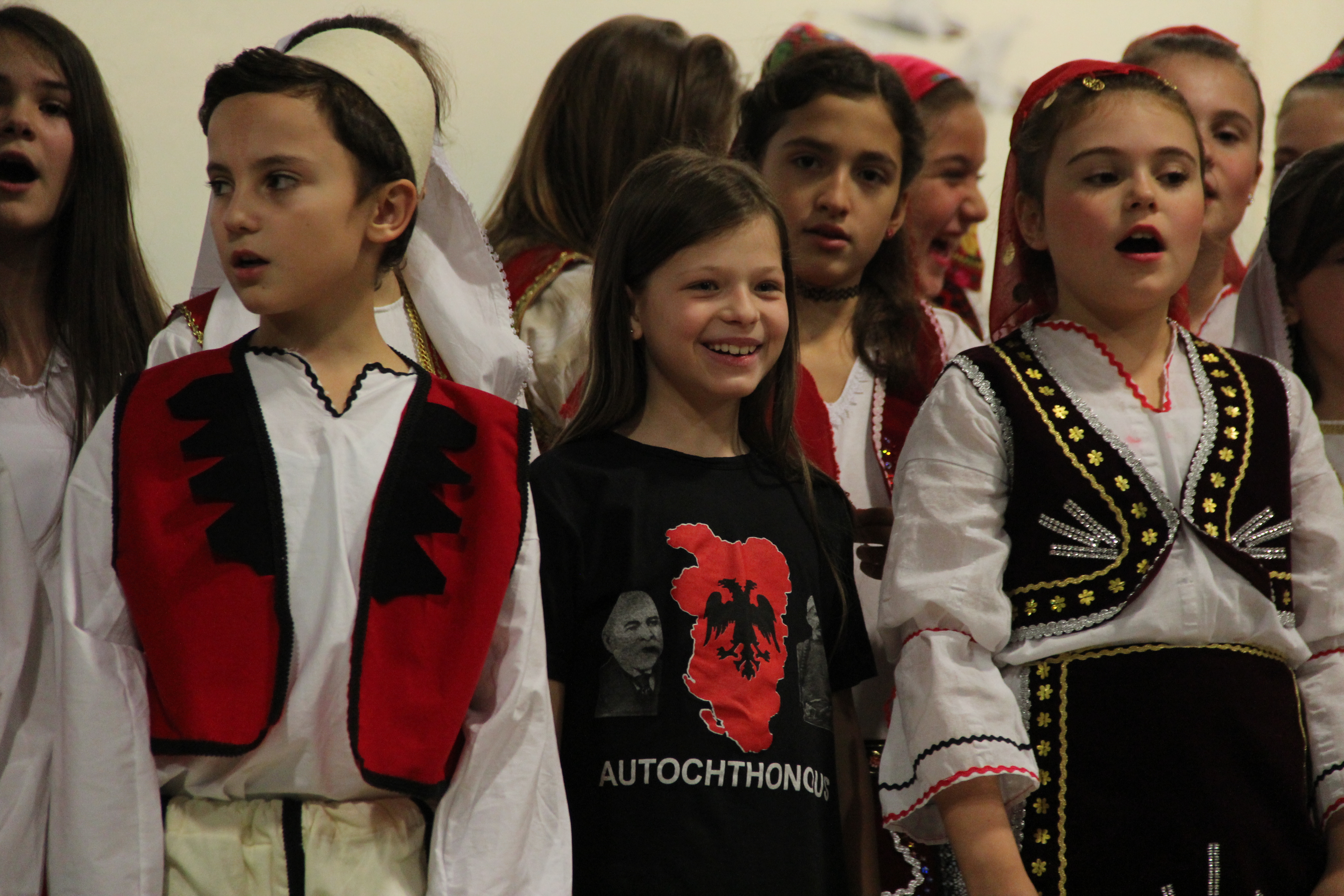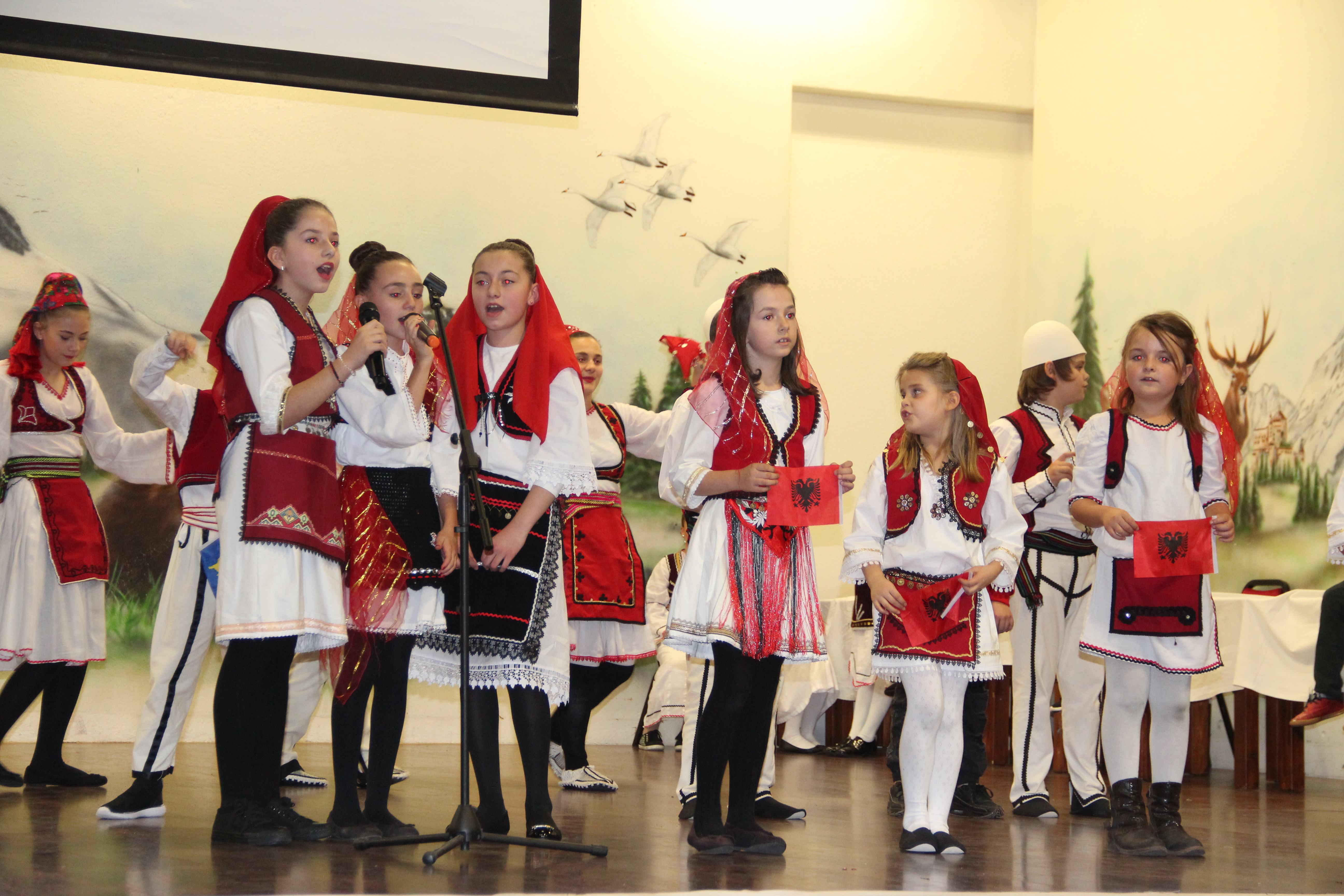 Në fillim në skenë u ngjiten fëmijët e shkollave shqipe për të intonuar himnin e flamurit kombëtar, nën dirigjimin e mësuesit Hasan Spahiu.
