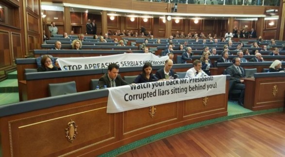 Deputetët opozitar u kthyen në Kuvend, por shpalosën disa slogane në gjuhën angleze: “Kujdes, zotëri president, të korruptuarit e gënjeshtarë janë ulur prapa jush”