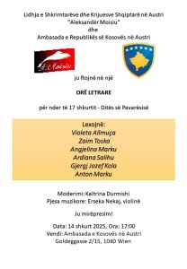 Edhe këtë vit, Lidhja e Shkrimtarëve dhe Krijuesve Shqiptarë në Austri “Aleksandër Moisiu”, në bashkëpunim me Ambasadën e Republikës së Kosovës në Vjenë, organizon njëaktivitet kulturor me fokus në letërsi.