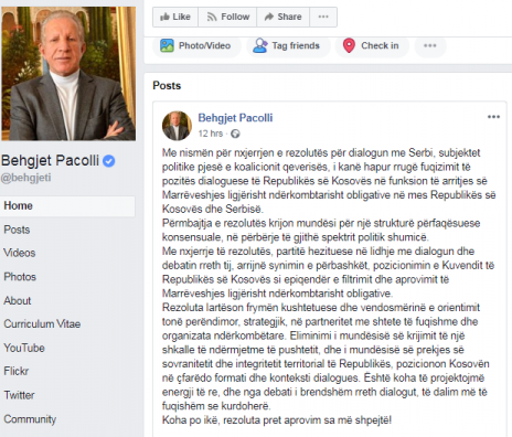 “Me nxjerrje të rezolutës, partitë hezituese në lidhje me dialogun dhe debatin rreth tij, arrijnë synimin e përbashkët, pozicionimin e Kuvendit si epiqendër e filtrimit dhe aprovimit të Marrëveshjes ligjërisht e ndërkombëtarisht obligative”, përfundon shkrimin Pacolli.