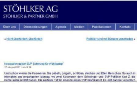 Është ngritur padi penale kundër Fidel Stöhlker, personit i cili në blogun e tij ishte shprehur me fjalë raciste lidhur me kosovarët. Sipas detyrës zyrtare, procedurën penale kundër Stöhlker-it e ka nisur Prokuroria shtetërore e Kantonit të Cyrihut, e cila akuzën e saj e ka mbëshetur në shkeljen e nenit për diskriminim racial 261 të Ligjit Penal, nga ana e tij.