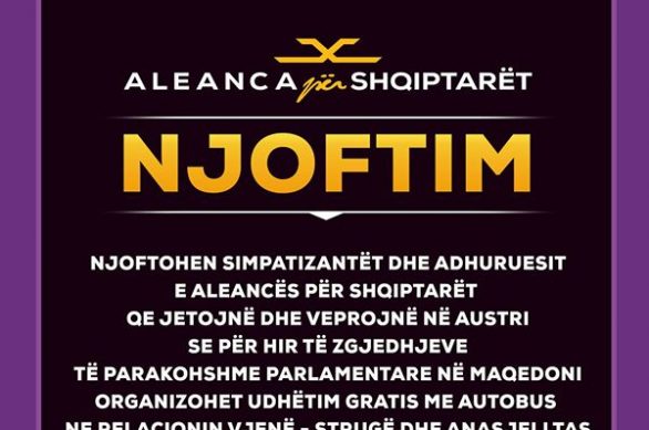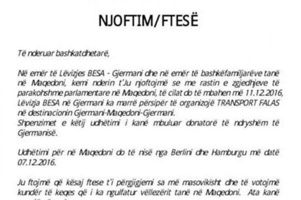 “Në emër të Lëvizjes Besa- Gjermani. Dhe në emër të bashkëfamiljarëve tanë në Maqedoni kemi nderin t`ju njoftojmë se me rastin e zgjedhjeve të parakohshme parlamentare në Maqedoni, Lëvizja Besa në Maqedoni ka marrë përsipër të organizojë transport falas në destinacionin Gjermani-Maqedoni-Gjermani”, thuhet veç tjerash në njoftim.