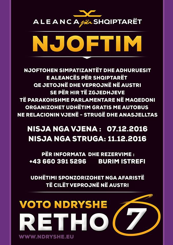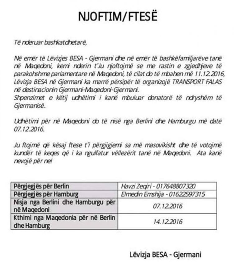 “Në emër të Lëvizjes Besa- Gjermani. Dhe në emër të bashkëfamiljarëve tanë në Maqedoni kemi nderin t`ju njoftojmë se me rastin e zgjedhjeve të parakohshme parlamentare në Maqedoni, Lëvizja Besa në Maqedoni ka marrë përsipër të organizojë transport falas në destinacionin Gjermani-Maqedoni-Gjermani”, thuhet veç tjerash në njoftim.