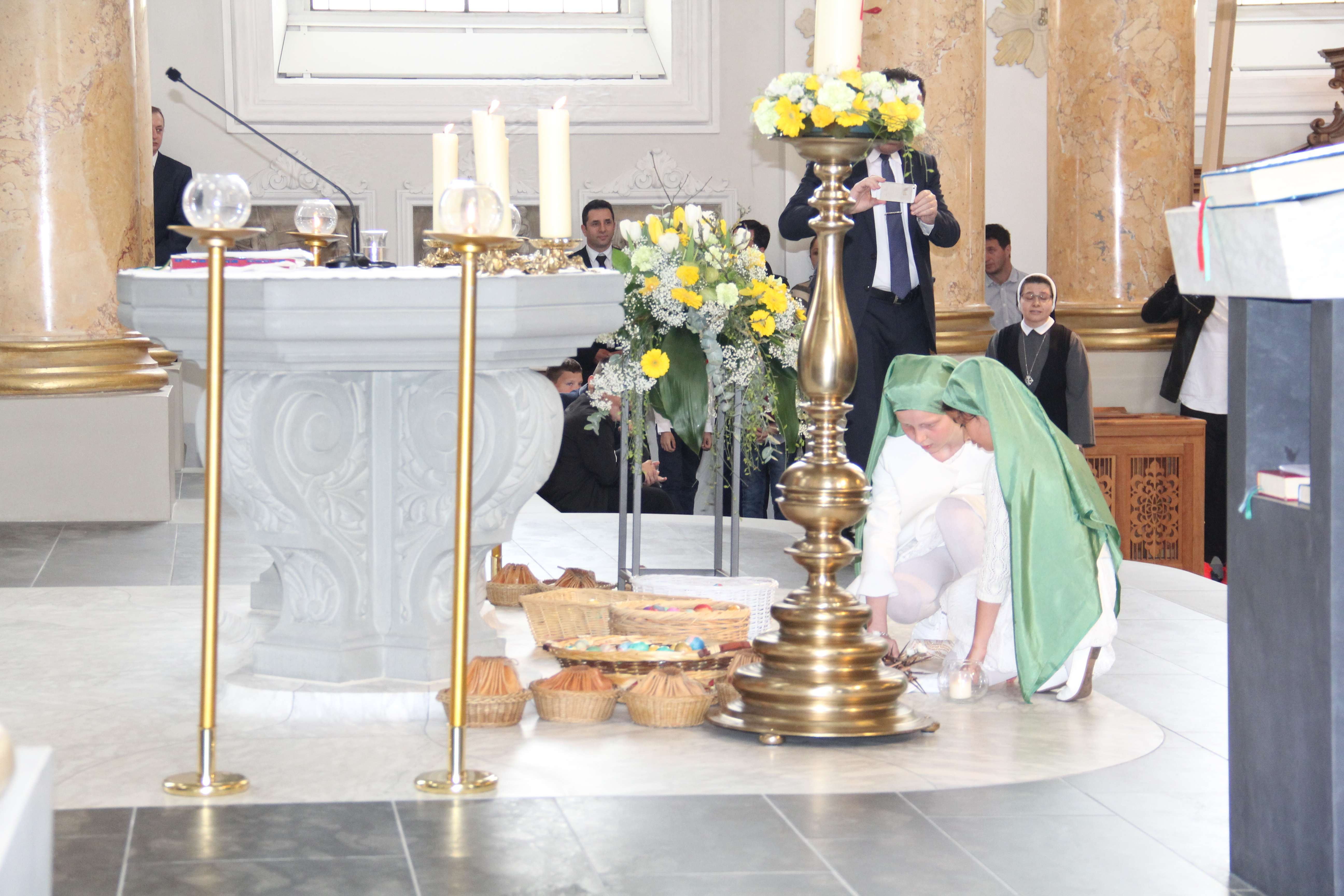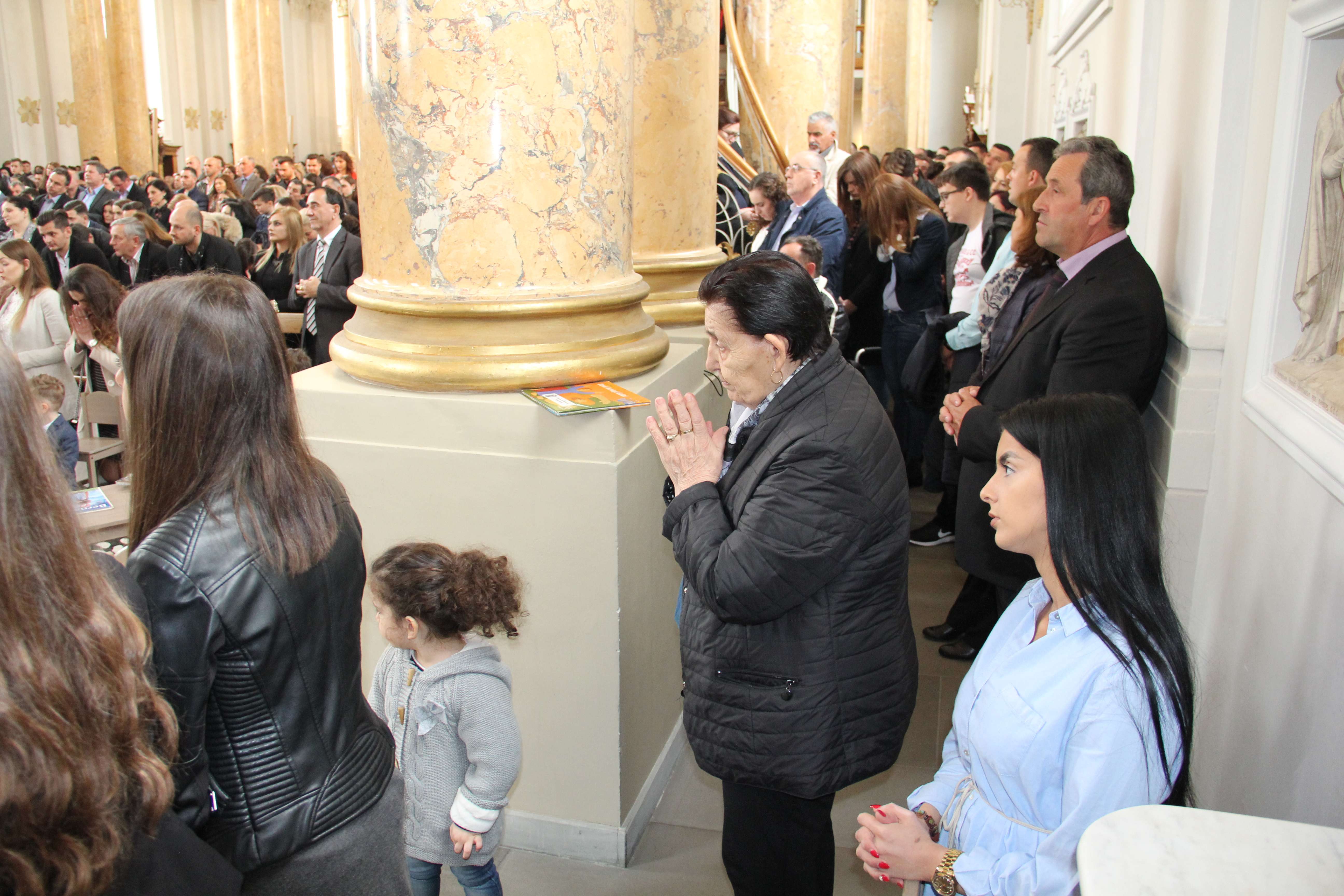 Në ceremoninë e bukur dhe shumëngjyrëshe të meshës së Pashkëve, të drejtuar nga Don Albert Demaj i ndihmuar nga Don Gjovani i ardhur nga Tirana, besimtarët e disiplinuar dhe të njohur me përmbajtjen japin ndihmesën e tyre. Don Alberti kujton në predikimin e tij se të krishterët për Pashkë shënojnë kalimin nga robëria në liri, nga urrejtja tek dashuria, nga e keqja tek e mira, nga errësira në dritë, me një fjalë nga vdekja në jetë.