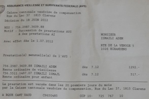 Nga viti 1994 ai kishte marrë pension invalidor në Zvicër, por kur mbushi moshën e pleqërisë, në pajtim me autoritetet zvicerane kishte marrë paratë e trustit pensional dhe kishte vendosur të kthehej në Kosovë. Për Albinfo.ch ai, ka treguar se këto veprime i kishte marrë pasi ishte konsultuar edhe me avokatin e tij, që të fillonte të marrë pensionin në Kosovë. Për këtë, ai ka ende në posedim edhe vendimet që i kishin lëshuar autoritetet zvicerane.