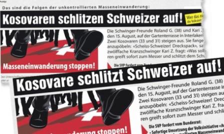 Reklama propaganduese e publikuar nëpër gazeta vitin e kaluar në kuadër të fushatës së SVP-së kundër imigracionit masiv me titullin: “Kosovarët therin zviceranin”, ka bërë që disa zyrtarë të lartë të këtij subjekti politik të përballen me drejtësinë për shkelje të ligjit mbi diskriminimin racor.