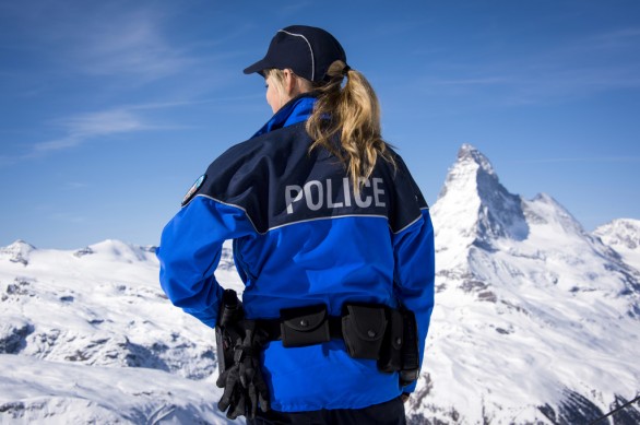 (KEYSTONE/Olivier Maire) Une policiere de la police cantonale valaisanne devant le Cervin a Zermatt le 8 avril 2015. (KEYSTONE/Olivier Maire) Eine Polizistin der Kantonspolizei Wallis am 8. April 2015 in Zermatt, im Hintergrund das Matterhorn. (KEYSTONE/OLIVIER MAIRE)