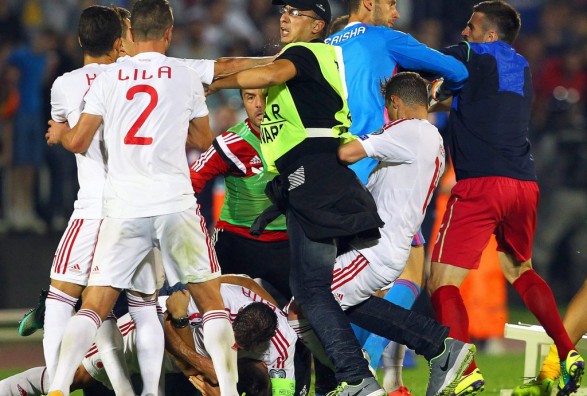 Incidenti kishte ndodhur kur një fluturake e dirigjuar me një Flamur Kuqezi fluturoi mbi stadium duke irrituar.tifozët serbë të cilët kanë hedhur gjësende në fushë dhe ka nxitur një përleshje ndërmjet futbollistëve shqiptarë dhe serbë.