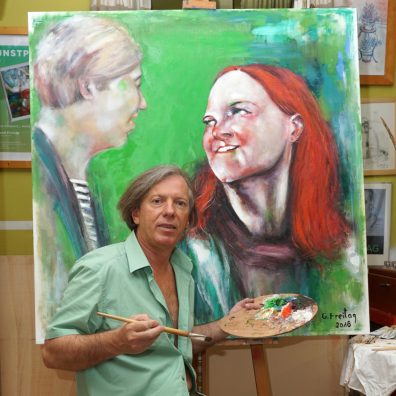 Në pikturën e tij, vaj në pëlhurë/kanavacë artisti Gazmend Freitag kap magjinë dhe shpresën e një takimi të tillë. E gjelbra dhe e kuqja shndritëse shprehin ndjenjën e një gjallërie shumë të afër.