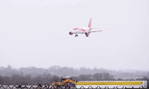 Një video e filmuar në aeroportin e Mançesterit tregon uljet e vështira të dy aeroplanëve në mes të stuhisë Emma ditën e enjte.