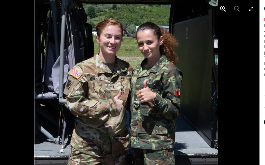 “Njihuni me të “parat” të cilat po bëjnë hapa përpara drejt barazisë. Togerja e 2-të Valdeta Mehanja (majtas), pilote helikopteri me Regjimentin e Aviacionit 1-131 nga Garda Kombëtare e Alabamës dhe shqiptare e lindur në Kosovë, bisedoi mbi ngjashmëritë midis tyre me piloten e helikopterit të parë shqiptare femër, Togeren e 2-të Armela Murati, në aerodromin e Farkës në Shqipëri, ndërsa marrin pjesë së bashku në #DefenderEurope 21. DEFENDER-Europe 21 nxit ndërveprimin midis aleatëve të NATO-s dhe vendeve partnere”, thuhet në shkrimin e ambasadës.