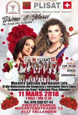Të nderuara zonja dhe zonjusha, Shoqata Kulturore “Plisat” në Dübendorf organizon manifestim për nderë të 8 Marsit – Ditës Ndërkombtare të Gruas.