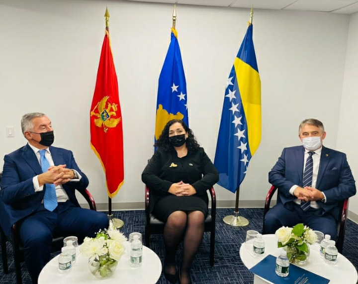 Presidentja e Kosovës, Vjosa Osmani, presidenti i Malit të Zi, Millo Gjukanoviq dhe kryetari i Presidencës së Bosnjës dhe Hercegovinës, Zheljko Komshiq u takuan sot në Nju Jork gjatë javës së Nivelit të Lartë në Asamblenë e Përgjithshme të OKB-së për të diskutuar zhvillimet në tri shtetet që përfaqësojnë dhe në Ballkanin Perëndimor.