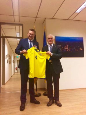 Ambasadori Cufaj në emër të Kryetarit të ri të Federatës së Futbollit të Kosovës, Agim Ademit dhe të Ministrit për Sport Kujtim Gashit, Presidentit të DFB i ka dhuruar një Triko të Kombëtares së Kosovës me Numrin e Kapitentit dhe Kryetarit legjendar të Federatës së Futbollit, Fadil Vokrrit.