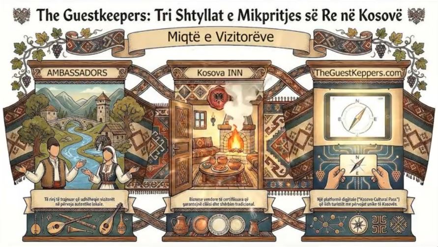 “Ndiqni transformimin e të rinjve të moshës 18-30 vjeç, të cilët nga nxënës kthehen në “Ambasadorë të Mikpritjes”, të trajnuar në protokoll diplomatik dhe turizëm kulturor. Zbuloni se si rrjeti “Kosova Inn” po certifikon bujtinat dhe artizanët lokalë për të garantuar autenticitet. Dhe për herë të parë, shihni se si teknologjia—përmes platformës “ www.Theguestkeepers.com “po i lejon turistët të prekin historinë para se ta vizitojnë atë fizikisht. Kjo nuk është vetëm turizëm; është diplomaci përmes kulturës…”, thuhet veç tjerash në prezantimin e projektit të përmendur në faqen e tij të internetit.
