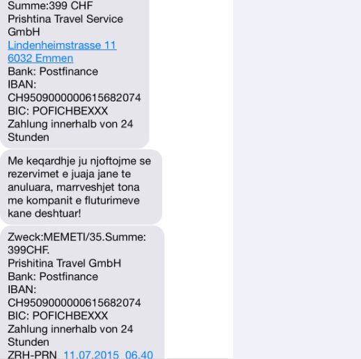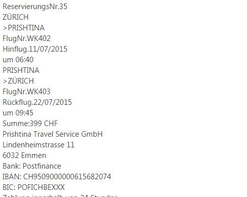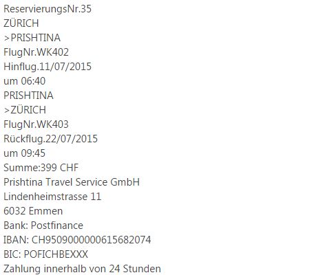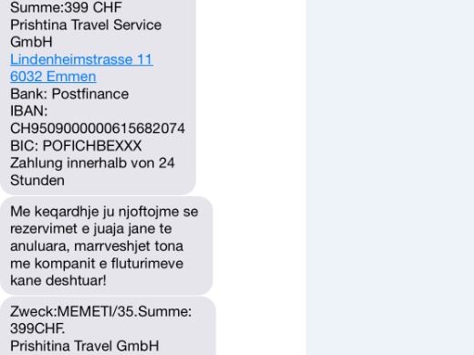 Albinfo.ch sjell dëshmi të udhëtarëve të mashtruar me bileta të rreme për në Prishtinë. Ata janë dëmtuar nga një agjenci e quajtur Prishtina Travel Services me seli në Emmen dhe nuk dihet nëse do t'i marrin paratë e tyre.