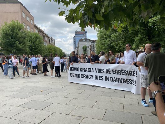 Duke e mbajtur një banerë të gjerë në dorë, me mbishkrimin “demokracia vdes në errësirë”, dhe duke fishkëllyer vazhdimisht, gazetarët marshuan nga sheshi Zahir Pajaziti deri te ai Skënderbeu në kryeqytet.