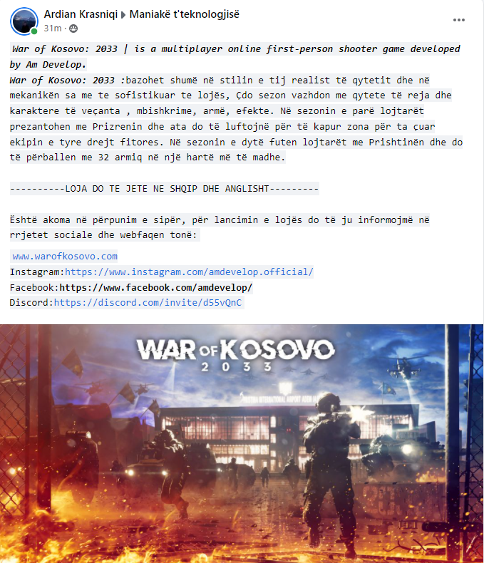 Kompania e Zhvillimit të Lojërave, Am Develop, do të lansojë video-lojën me luftime me shumë lojtarë që do të titullohet War of Kosovo: 2033.
