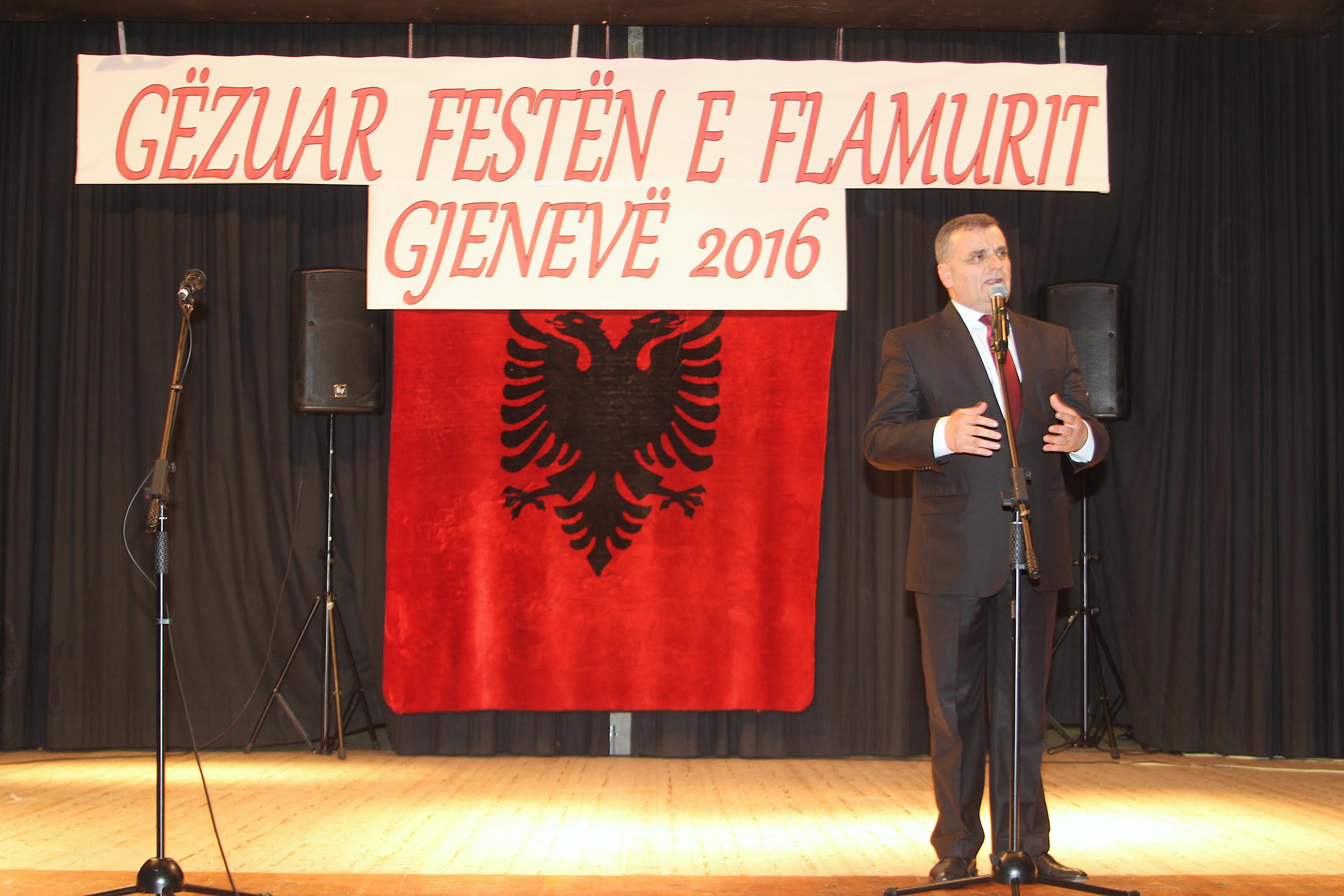 E, ndërkohë në podium është ftuar Z. Ramadan Avdiu, konsull i përgjithshëm i Republikës së Kosovës në Gjenevë. Avdiu ka shpalosur historikun e Shqipërisë dhe të shqiptarëve që nga periudha e kryeheroit tonë kombëtar Gjergj Kastrioti –Skënderbeu e deri në flijimin e legjendarit Adem Jashari, i cili duke sakrifikuar vetveten dhe familjen e gjerë u bë simbol nderi dhe krenarie ndër shqiptarë.