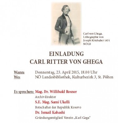 Promovimi i biografisë së arkitektit të njohur shqiptar Karl Gega, do të mbahet më 23 prill 2015 në ora 18:00 në NÖ Landesbibliothek, Kulturbezirk 3, St. Pölten.