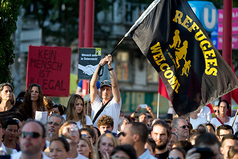 Demonstruesit mbanin pankarta ku shkruhej: "Evropa është lagja më e afërt me Sirinë" dhe "Mirë se vini refugjatë"