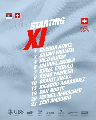Tashmë janë publikuar formacionet zyrtare të ndeshjes teksa kapiteni i Zvicrës, Granit Xhaka do të jetë në fushë që nga fillimi, transmeton albinfo.ch.
