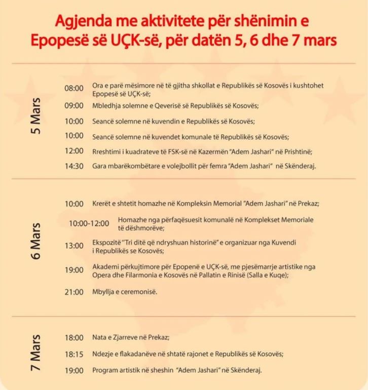 Agjenda me aktivitetet për shënimin e Epopesë së UÇK-së, për datën 5, 6 dhe 7 mars.