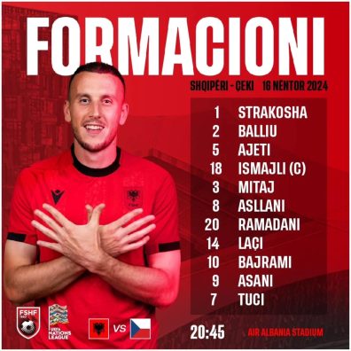 Ndeshja Shqipëri – Çeki fillon nga ora 20:45 dhe i takon Grupit 1 të Ligës B të Ligës së Kombeve.