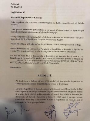 Në takim kanë qenë kryeministrin Ramush Haradinaj, zëvendëskryeministrat Fatmir Limaj, Enver Hoxhaj dhe Dardan Gashi. Pika e parë e këtij dokumenti thotë që Dialogu të mbyllet me njohje reciproke dhe se Kosova është vend unik e i pandarë.